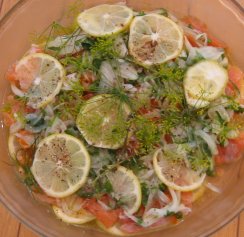 薄切りして水にさらした玉ねぎとスモークサーモンを塩・胡椒・レモン汁・オリーブオイルであえ、ディルの葉・花、レモンタイムの葉・花、レモンの薄切りをあわせて冷蔵庫で冷やします。一晩置くと味がなじみますが、急ぐときは数時間でも大丈夫。花はそのまま食べられるように、若くて柔らかいものをつみます。
