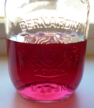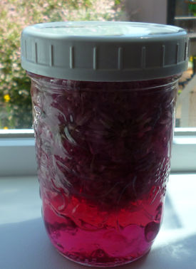 丸い花の部分だけを使うので、茎を切り取ります。それを瓶にぎっちり詰めていきます。花の量はお好みで。濃い赤にしたいなら大目、薄いピンクなら少な目。詰めたら、上からお酢を瓶の口よりちょっと下まで注いでフタをします。そして台所の棚などに置いて、漬け上がるのを待つだけ。私はダイニングの窓ぎわに置いて、日々色が濃くなるのを見て楽しみました。