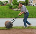張替えはたっぷり丸一日がかりの作業。芝生地が配達されるまで、早朝から作業を開始します。ローラーで土を平らにし、芝用スターター肥料を一面に撒きます。この肥料はリンが豊富で、新しい芝の根の成長を助けます。
